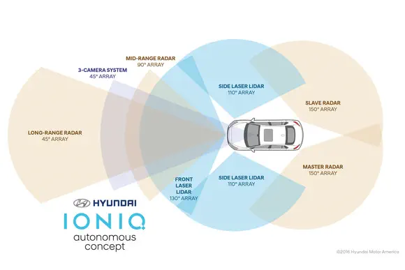 Daarvoor past Hyundai onder meer LiDAR-laser, GPS, radar en camera's toe. Met name de toepassing van de LIght Detection And Ranging of Laser maakt het mogelijk dat de Ioniq eruit blijft zien als een normale personenauto. Het zogenaamde 'High Definition mapping', het maken van 3D-modellen wat zich waar bevindt om de auto heen, moet minder computerkracht gaan kosten dan bij de meeste zelfrijdende auto's, ook weer om de kosten te drukken. Alle nieuwe techniek wordt geïntegreerd met de assistentiesystemen die de reguliere Ioniq reeds bezit, zoals Smart Cruise Control en Emergency Braking.