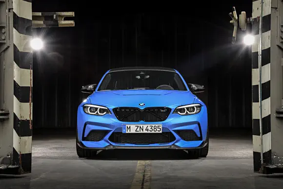 Aan de buitenkant herken je de M2 CS aan de koolstofvezel toevoegingen, zoals extra spoilers op de achterklep en onder de voorbumper. De opnieuw vormgegeven motorkap met extra luchtinlaat is ook van het lichtgewicht materiaal gemaakt, net als het dak. Gewichtsbesparing heeft BMW ook bereikt door speciale wielen te monteren, die naar wens in een matgouden kleur worden afgewerkt. Kopers kunnen kiezen tussen ‘Cup’-banden, die op het circuit beter presteren, en meer reguliere ‘allround’-banden.