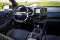 Het onderstel is geënt op sportiviteit. Overhellen doet de Kona amper, je kunt er snóeihard mee door bochten en op dat gebied levert de Kona meer dan gemiddeld rijplezier. Daar lever je wel wat comfort voor in. Vooral op korte oneffenheden voel je de stugheid van de veren, op verkeersdrempels merk je dat ook de demping behoorlijk straf is. Het zorgt ervoor dat de auto nooit nadeint en de Kona niet snel uit balans raakt, maar zelfs op de snelweg voel je veel van het wegdek. Misschien komt het deels door de grote 18 inch wielen met platte banden, maar op de Premium-uitvoering kun je niet voor kleinere kiezen.